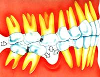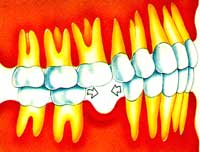 Com a migração dos dentes, o plano oclusal, como consequência, se modifica: os movimentos normais da mandíbula na mastigação são afetados, gerando um quadro atípico que pode interferir no periodonto e na articulação da mandíbula. | ||
